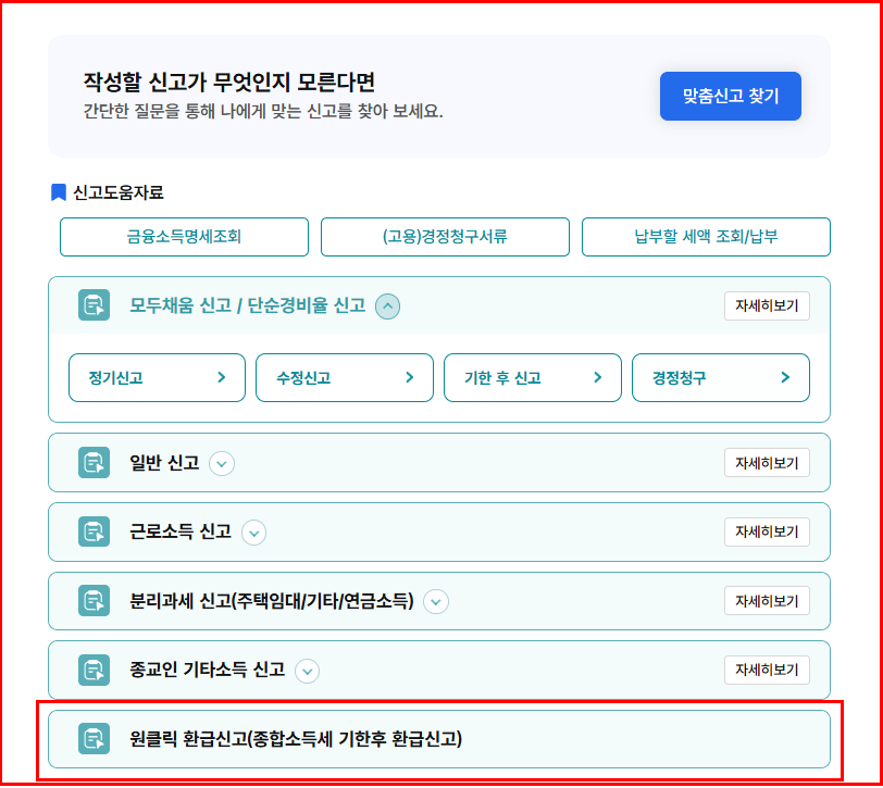 환급금이 언제쯤 들어오는지 궁금하다면 홈택스 또는 손택스에서 간단히 확인할 수 있습니다. 홈택스에서 로그인만 하면 현재는 종합소득세 기간이기 때문에 아래 사진과 같이 원클릭 조회를 하시면 바로 확인하실 수 있어요.
