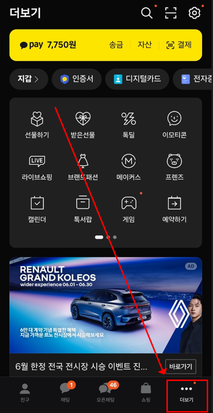 발급 시작은 카카오톡 더보기 메뉴에서 가능합니다. 카카오톡 실행 → 우측 하단 [더보기(…)] → 상단 ‘카카오지갑’ 아이콘을 누르면, 이 안에서 ‘인증서’를 바로 확인할 수 있습니다.