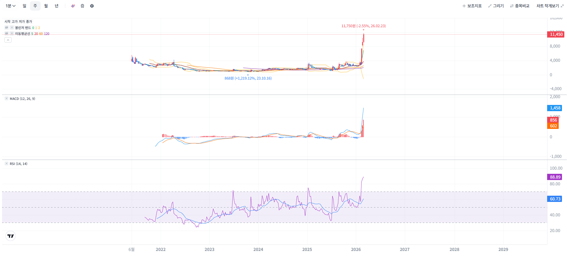 거래량도 없고, 관심도 없고, 완전한 수면 상태였다. 그런데 2025년 말~2026년 초를 기점으로 주가가 수직으로 치솟으며 11,750원(고점)을 찍었다.